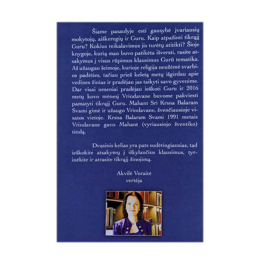 Šiame pasaulyje esti gausybė įvariausių mokytojų, aiškeregių ir Guru. Kaip atpažinti tikrąjį Guru? Kokius reikalavimus jis turėtų atitikti? Šioje knygoje, kurią man buvo patikėta išversti, rasite atsakymus į visus rūpimus klausimus Guru tematika. Aš užaugau šeimoje, kurioje religija neužėme svarbios padėties, tačiau prieš keletą metų išgirdau apie vedines žinias ir pradėjau jas taikyti savo gyvenime. Dar visai neseniai pradėjau ieškoti Guru ir 2016 metų kovo mėnesį Vrindavane buvome pakviesti pamatyti tikrąjį Guru. Mahant Sri Krsna Balaram Svami gimė ir užaugo Vrindavane, švenčiausioje visatos vietoje. Krsna Balaram Svami 1991 metais Vrindavane gavo Mahant (vyriausiojo šventiko) titulą.