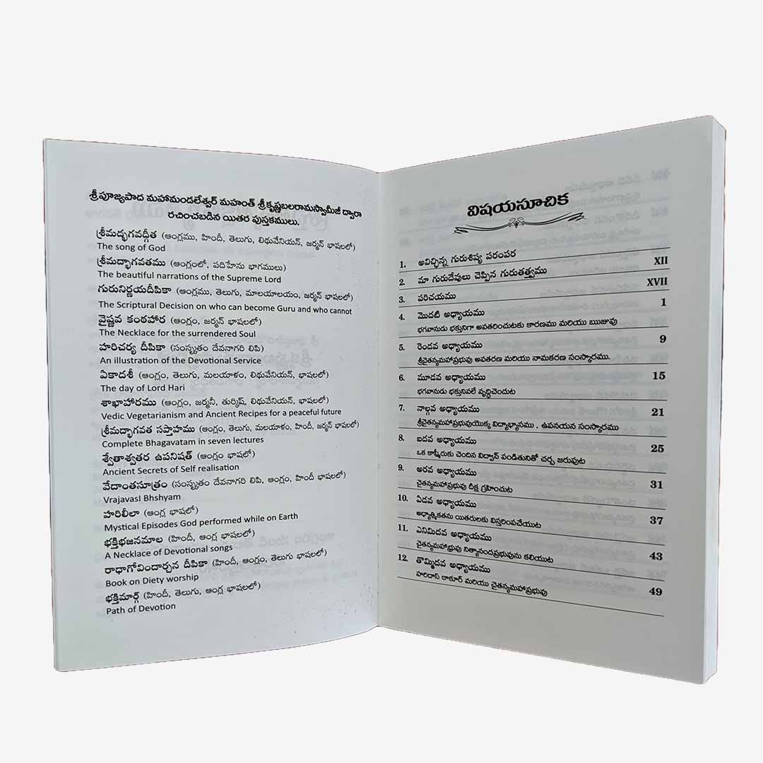 This book presents the pastmes and teachings of Lord Chaitanya Mahaprabhu, as well as the reasons for His appearance. Lord Chaitanya Mahaprabhu is the Supreme God, Lord Sri Krsna Himself, and appeared about five hundred years ago as His own devotee. He has mercifully bestowed His spiritual teachings upon the people of this world. If anyone studies this book earnestly, then they will learn that the teachings of Lord Chaitanya include the essence of all the Vedic knowledge – including the knowledge of the Vedas, the Puranas, the Ithasas, and the Upanishads. Moreover, whatever knowledge is not available elsewhere is procurable in this book. The knowledge presented in this book is very simple and can easily be understood by everyone. It is congenial to the learned who are bestowed with scriptural knowledge and have the determinaton to judge between right and wrong.