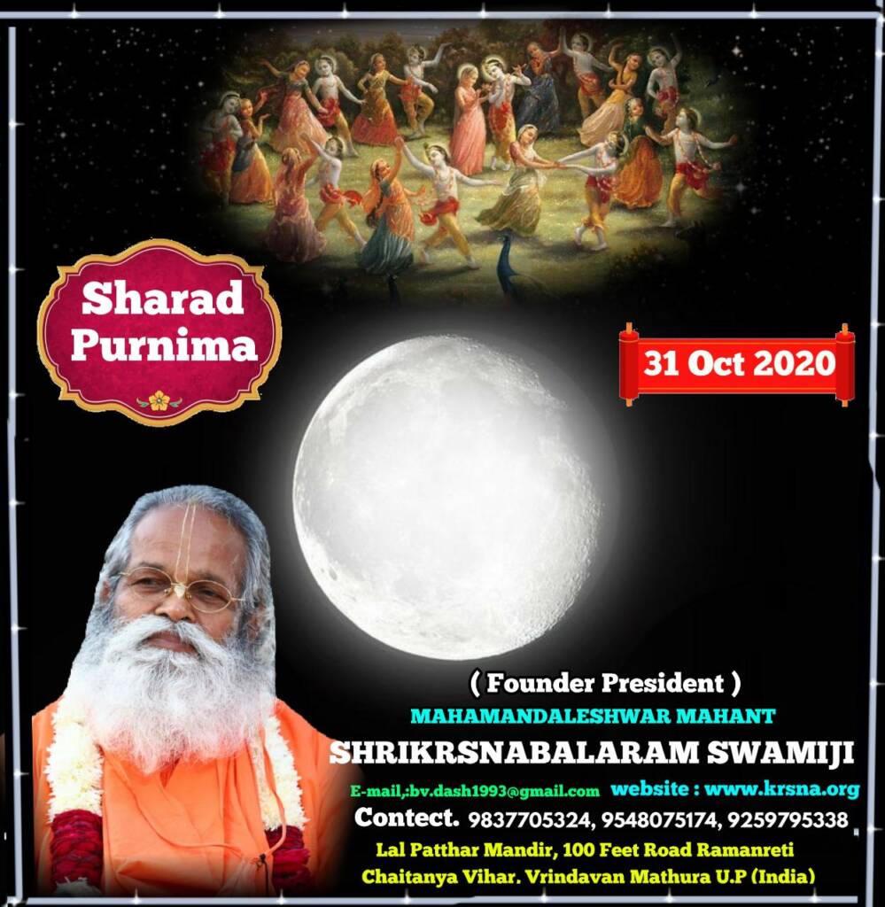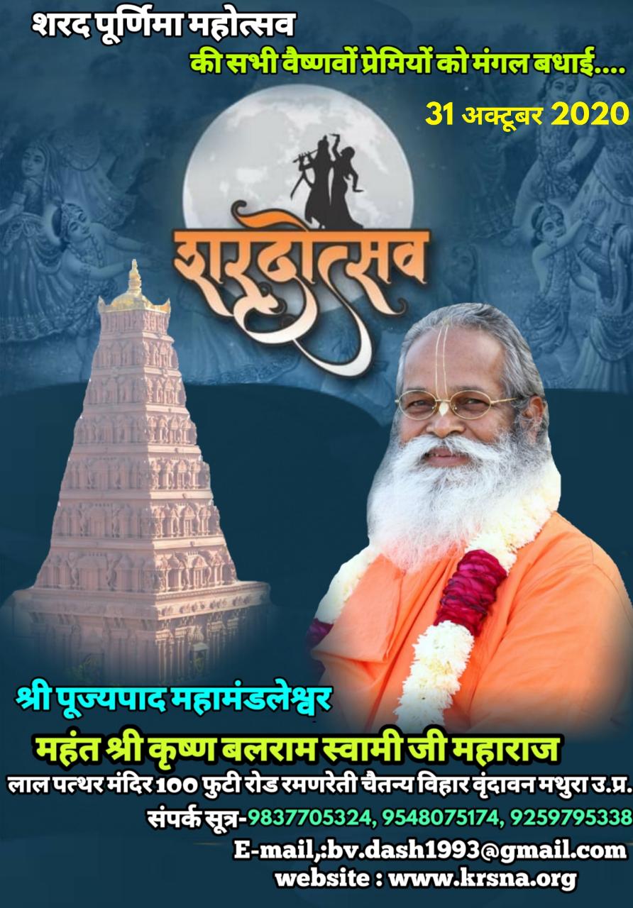 Sharadiya Purnima celebrations held at the Sri Sri Radha Govinda Mandir (Red Stone Temple), Raman Reti, Vrindavan, India. With the presence of His Divine Grace Mahamandaleshwar Mahant Sri Krsna Balaram Swamiji Maharaj.